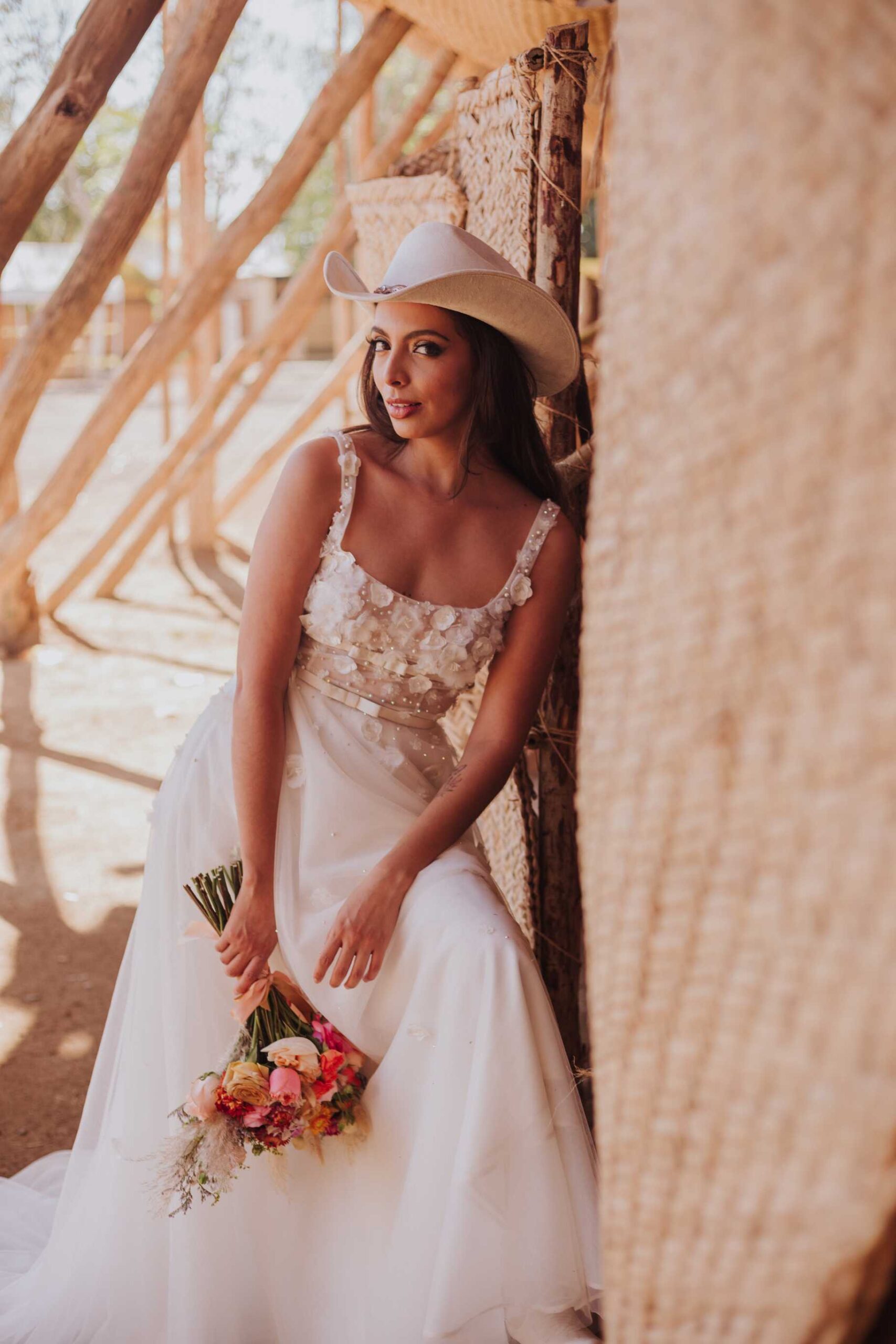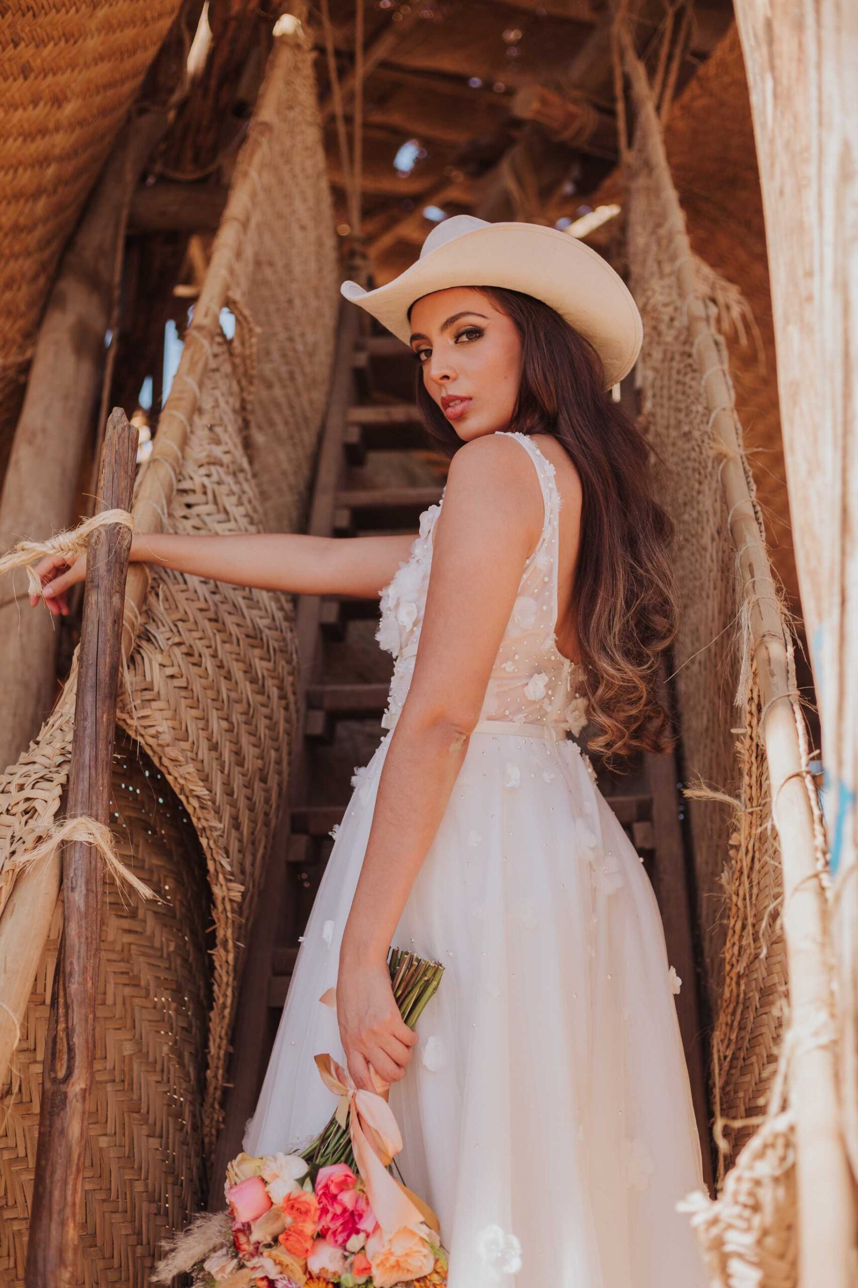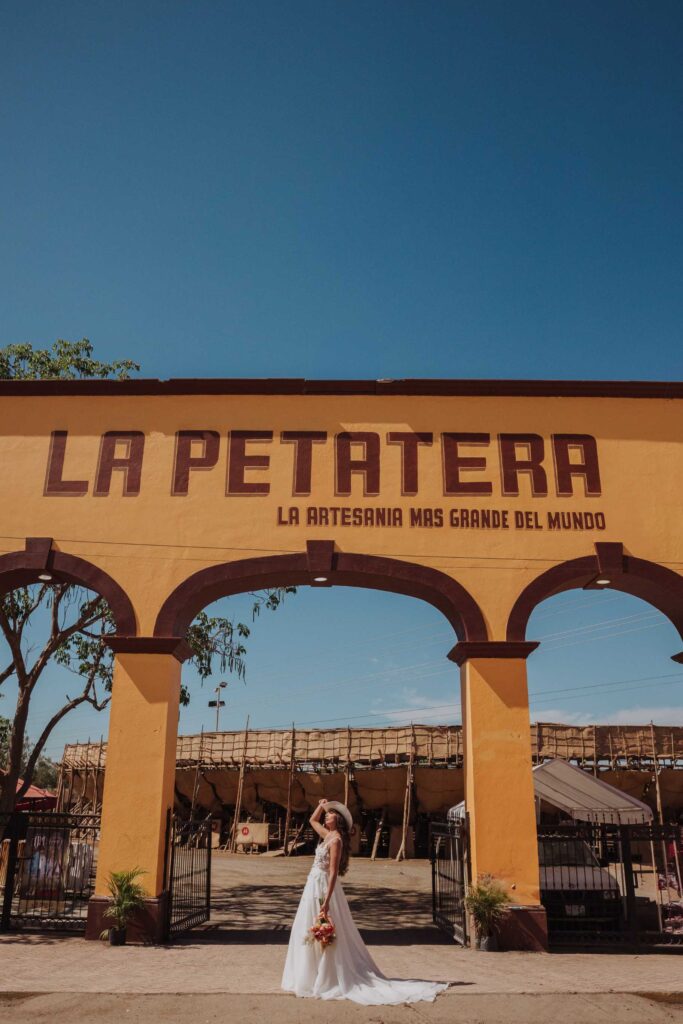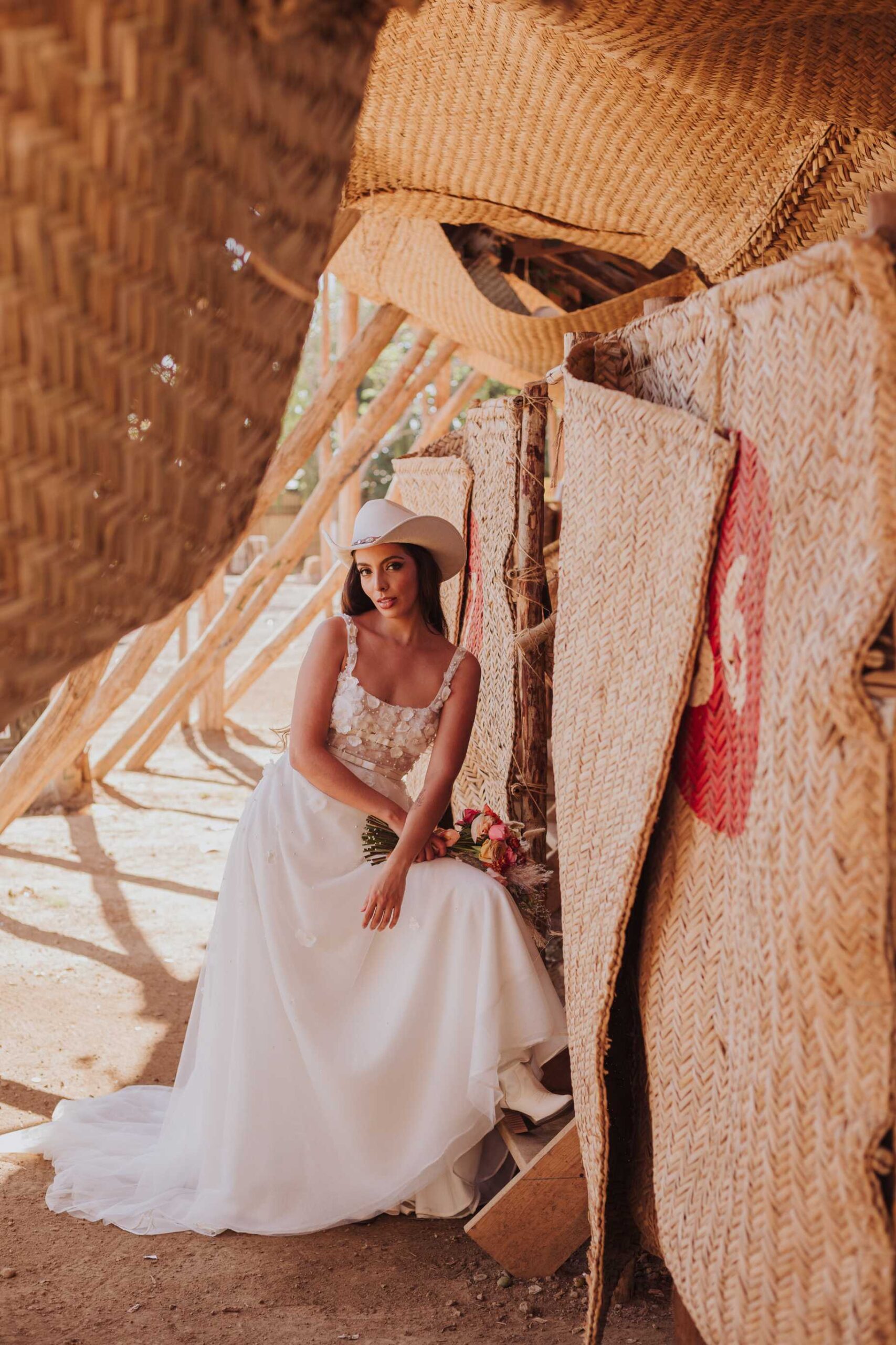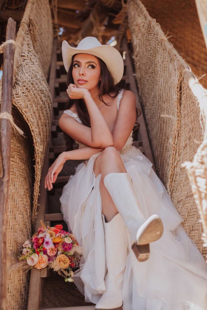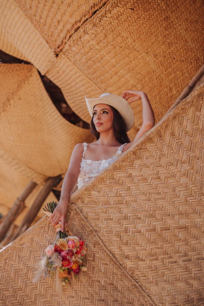 Le llaman La Petatera porque está hecha prácticamente solo de 3 materiales: petate, lazo y madera. Este símbolo de Colima nos inspiró a hacer un shooting de fotos estilo cowgirl porque justo así es el look de los que visitan la Petatera: botas, jeans y un sombrero con estilo vaquero.